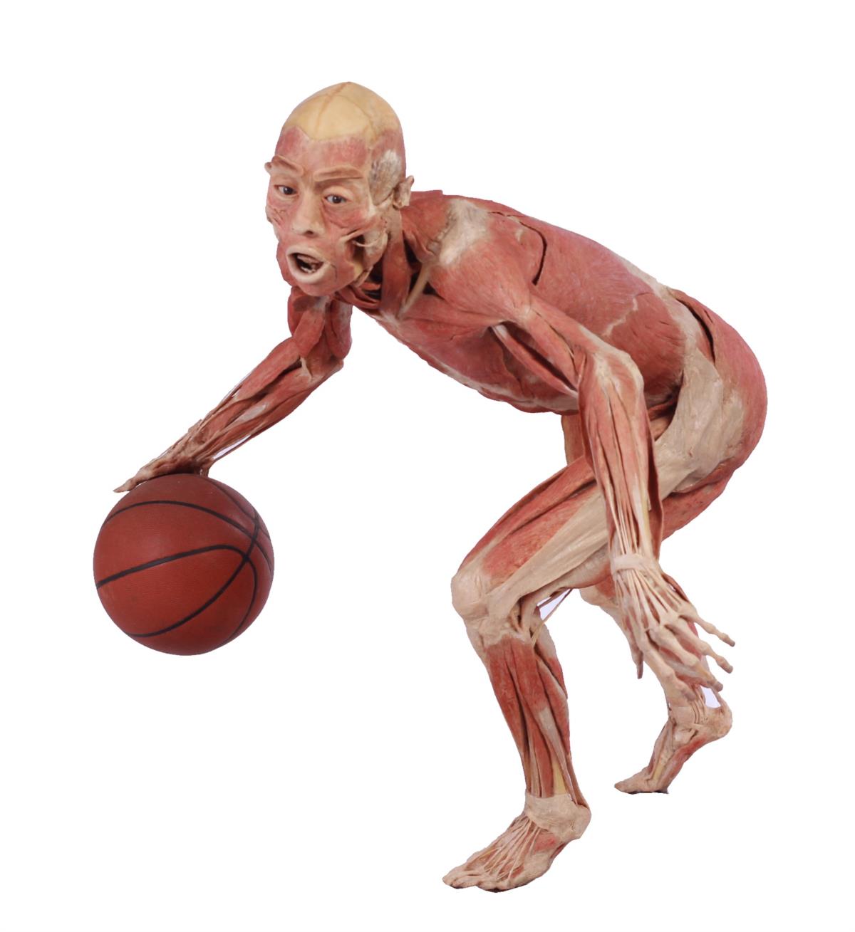 Uma bailarina, um lançador de pesos, um basquetebolista com a bola na mão – três corpos literalmente sem pele, músculos flectidos, parados, mas cheios de movimentos. Há uma galeria na exposição Real Bodies – Descubra o Corpo Humano dedicada inteiramente ao desporto, para mostrar que o corpo humano está concebido para o movimento.