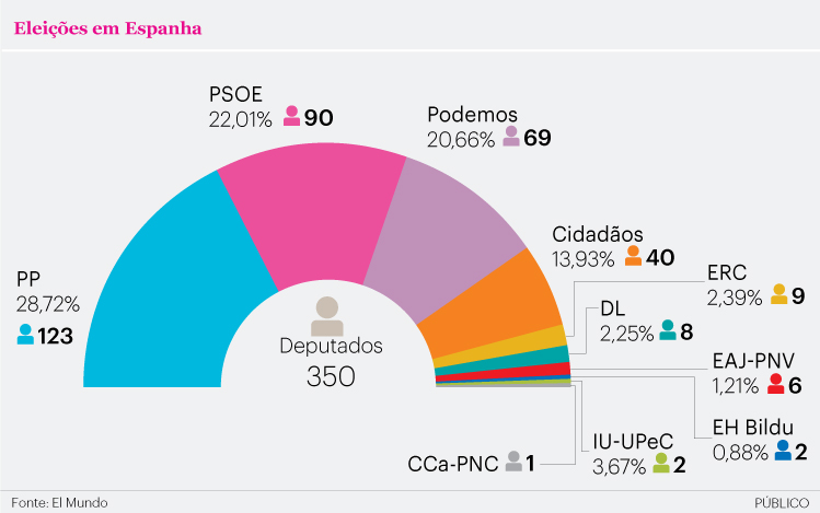 O PP, de Mariano Rajoy, que governou nos últimos quatro anos com maioria a absoluta, elegeu 123 deputados e conseguiu 28,71%, seguido do Partido Socialista, com 22% e 90 deputados. Em terceiro lugar surge o Podemos, de Pablo Iglesias, com 20,65% dos votos e 69 deputados, tornando-se na primeira força política na Catalunha e no País Basco.