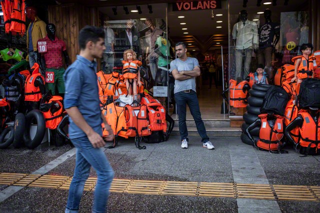 As lojas têm as montras atafulhadas com artigos que possam ser úteis a quem atravessa o mar Egeu numa embarcação precária: balões vazios, para envolver e proteger os telemóveis no caso de se cair à água, lanternas, barretes e toucas para o frio, e até blocos de notas feitos num papel especial à prova de água, para que não se percam os números de telefone, nomes e notas necessários para se prosseguir a viagem.