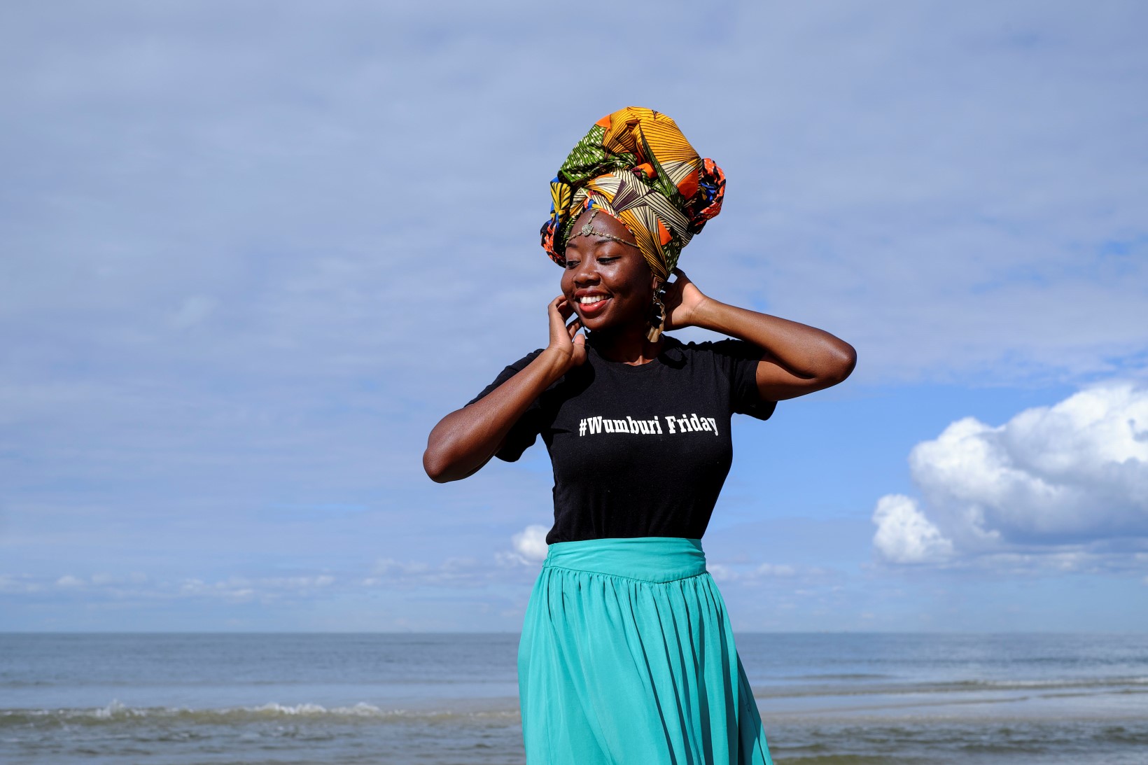 A Wumburi é também fundada pela amiga Eliana Nzualo (n.1991), escritora que trabalha numa empresa de comunicação. “Em geral temos muitas referências ocidentais naquilo que é a arte, o belo”, comenta Eliana Nzualo na FEIMA, a Feira de Artesanato de Maputo — é um parque onde vários feirantes têm produtos tipicamente moçambicanos à venda, de capulanas a cestos ou chapéus e sacos de verga; há quem os pendure nas árvores, criando uma imagem onírica com os padrões africanos dos tecidos estampados nas malas de palha suspensas. De cabelo muito curto e pintado de loiro, Eliana Nzualo faz parte de uma geração de moçambicanos que estudou fora, viajou, traz influências cosmopolitas, tem informação sobre o que era o colonialismo e consciência do que significou para as relações raciais. Moçambique é um país jovem, em que 65% dos 25 milhões de habitantes têm menos de 25 anos e 45%, menos de 15 anos. “Tento usar o turbante duas, três vezes por semana. Temos o turbante para grandes cerimónias, é raro as pessoas usarem-no a uma segunda-feira. Queremos tornar isso algo normal. E aprender a usá-lo sempre.”
