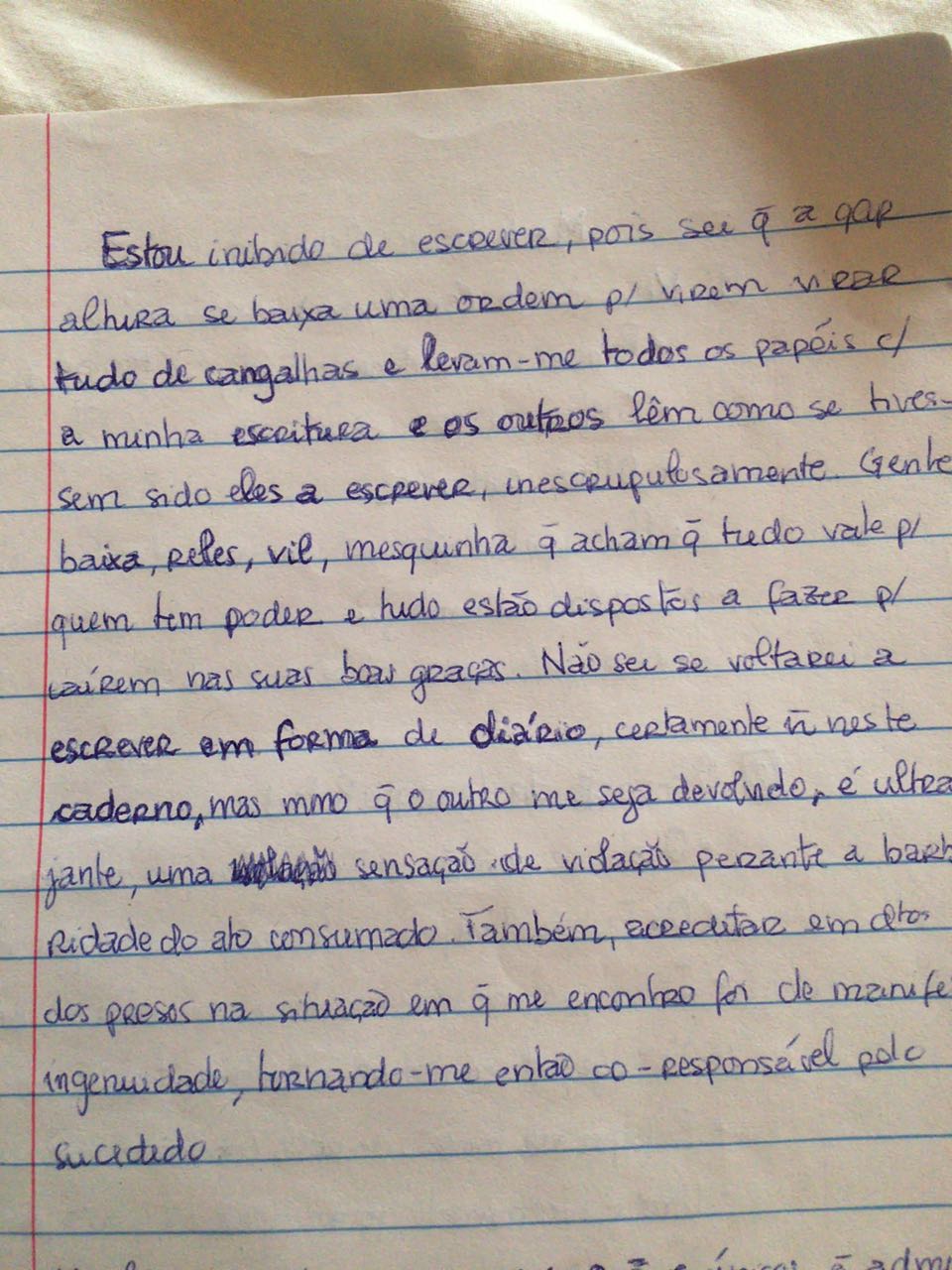 Estou inibido de escrever, pois sei que a qualquer altura se baixa uma ordem para virem virar tudo de cangalhas e levam-me todos os papéis e a minha escritura e os outros lêem como se tivessem sido eles a escrever, inescrupulosamente. Gente baixa, reles, vil, mesquinha que acha que tudo vale para quem tem poder e tudo estão dispostos a fazer para caírem nas suas boas graças. Não sei se voltarei a escrever em forma de diário, certamente não neste caderno, mas, mesmo que o outro me seja devolvido, é ultrajante, uma sensação de violação perante a barbaridade do acto consumado. Também acreditar em direitos dos presos na situação em que me encontro foi de manifesta ingenuidade, tornando-me então co-responsável pelo sucedido.