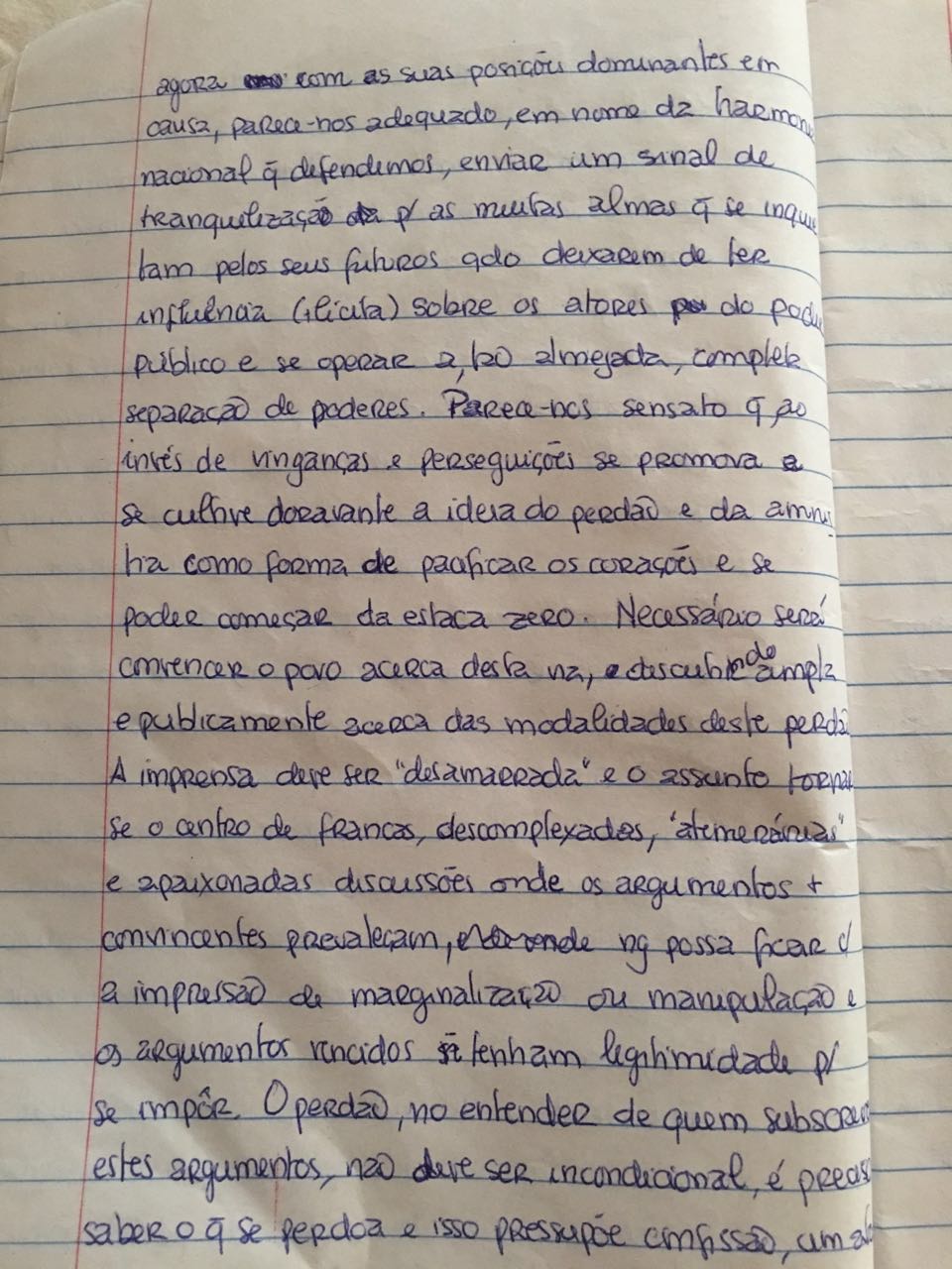 Entendo a delicadeza da situação à qual fomos sendo trazidos e a complexa teia de interesses que se teceu em torno da cúpula do poder que se vê agora com as suas posições dominantes em causa; parece-nos adequado, em nome da harmonia nacional que defendemos, enviar um sinal de tranquilização para as muitas almas que se inquietam pelos seus futuros quando deixarem de ter influência (ilícita) sobre os actores do poder público e se operar a tão almejada completa separação de poderes. Parece-nos sensato que, ao invés das vinganças e perseguições, se promova e se cultive doravante a ideia do perdão e da amnistia como forma de pacificar os corações e se poder começar da estaca zero. Necessário será convencer o povo acerca desta via, discutindo ampla e publicamente acerca das modalidades deste perdão.