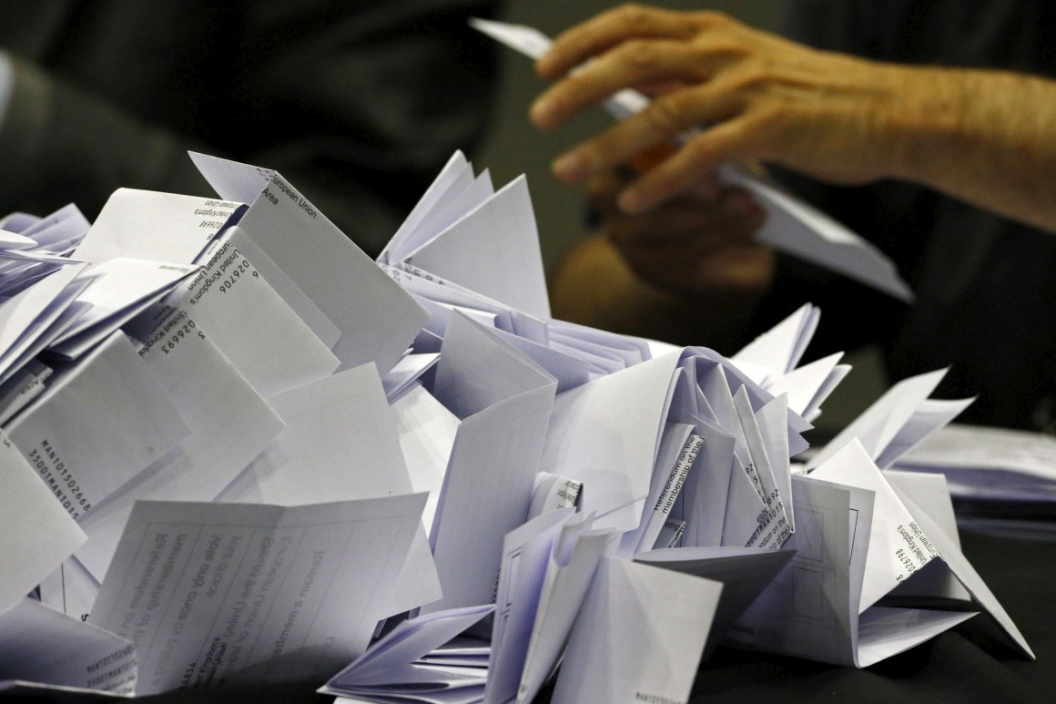 Com o escrutínio completo em 31 das 382 circunscrições, o In tem 46,9% e Out 53,1%.