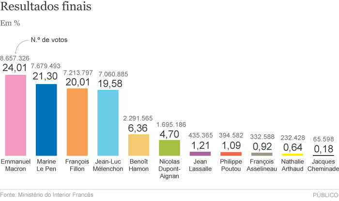 Resultados finais: Macron 24%/ Le Pen 21,3%