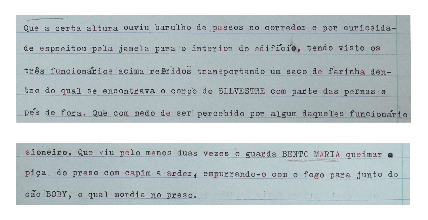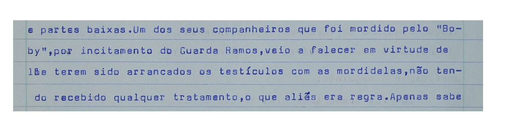 O mesmo momento foi testemunhado por Cupela Muahamara e a mesma prática referida por muitos ex-prisioneiros e funcionários da PIDE, como o auxiliar Sebastião Choquela Esteira. “Viu pelo menos duas vezes o guarda Bento Maria queimar a piça dos presos com capim a arder, empurrando-os com o fogo para junto do cão Boby, o qual mordia os presos.”