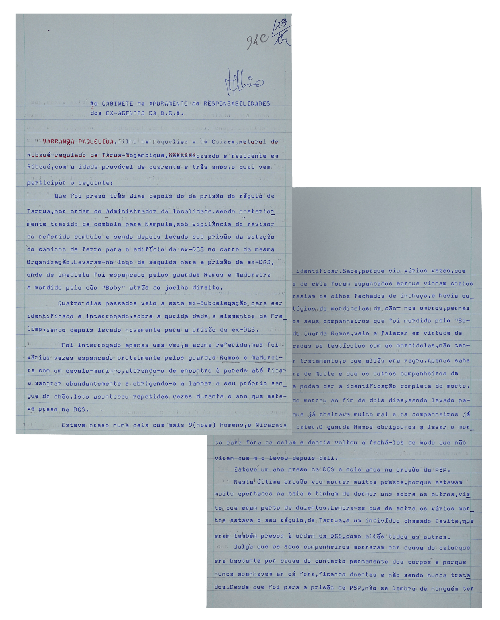 A 5 de Julho de 1974, um homem chamado Varranja Paqueliua, que desconhecia a sua idade mas aparentava ter cerca de 40 anos, sentou-se frente a dois oficiais do Exército português numa sala do quartel-general em Nampula. Viajara 150 quilómetros desde Ribauè até esta capital provincial no Nordeste de Moçambique para depor perante o “gabinete de apuramento de responsabilidades dos ex-agentes da DGS”.