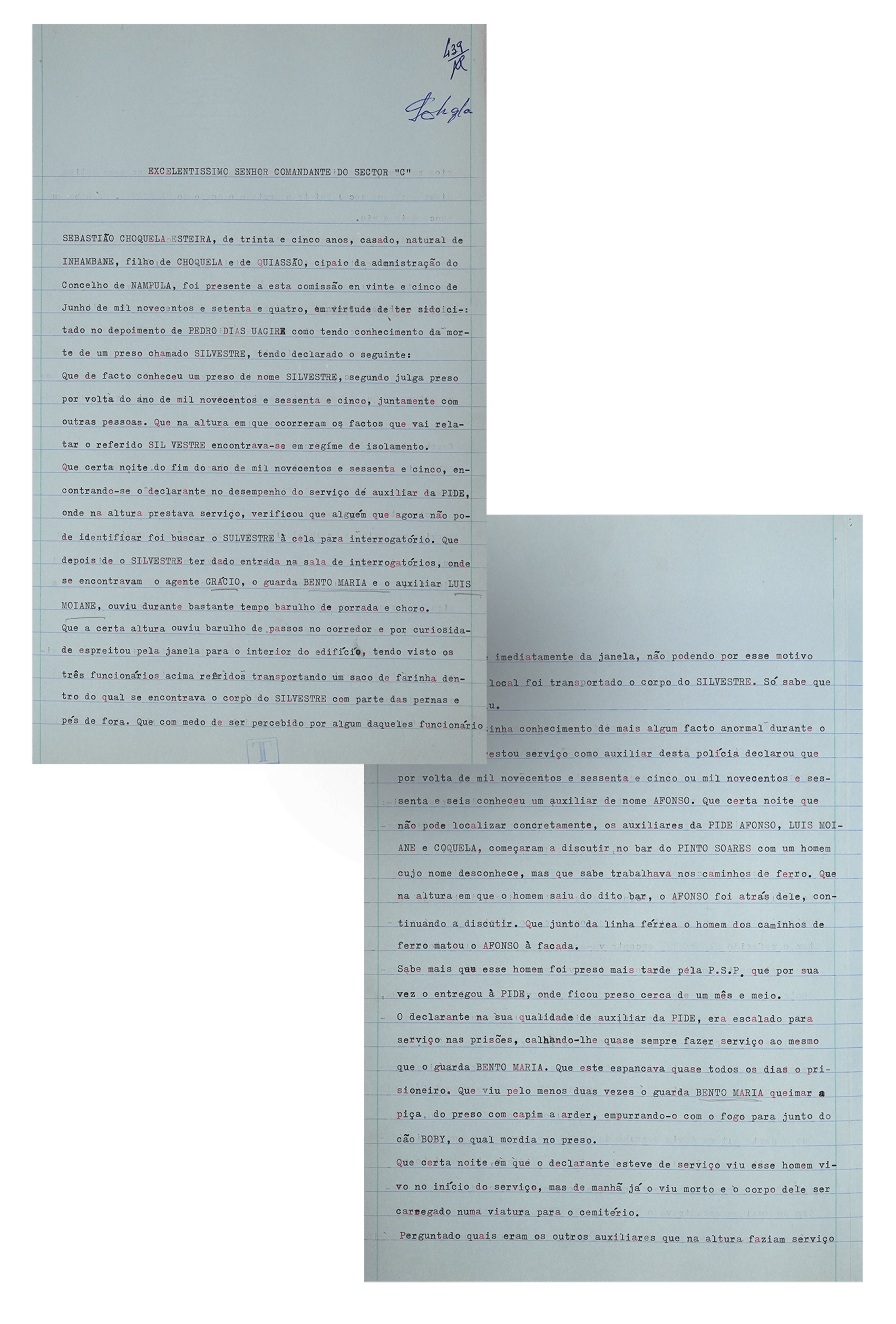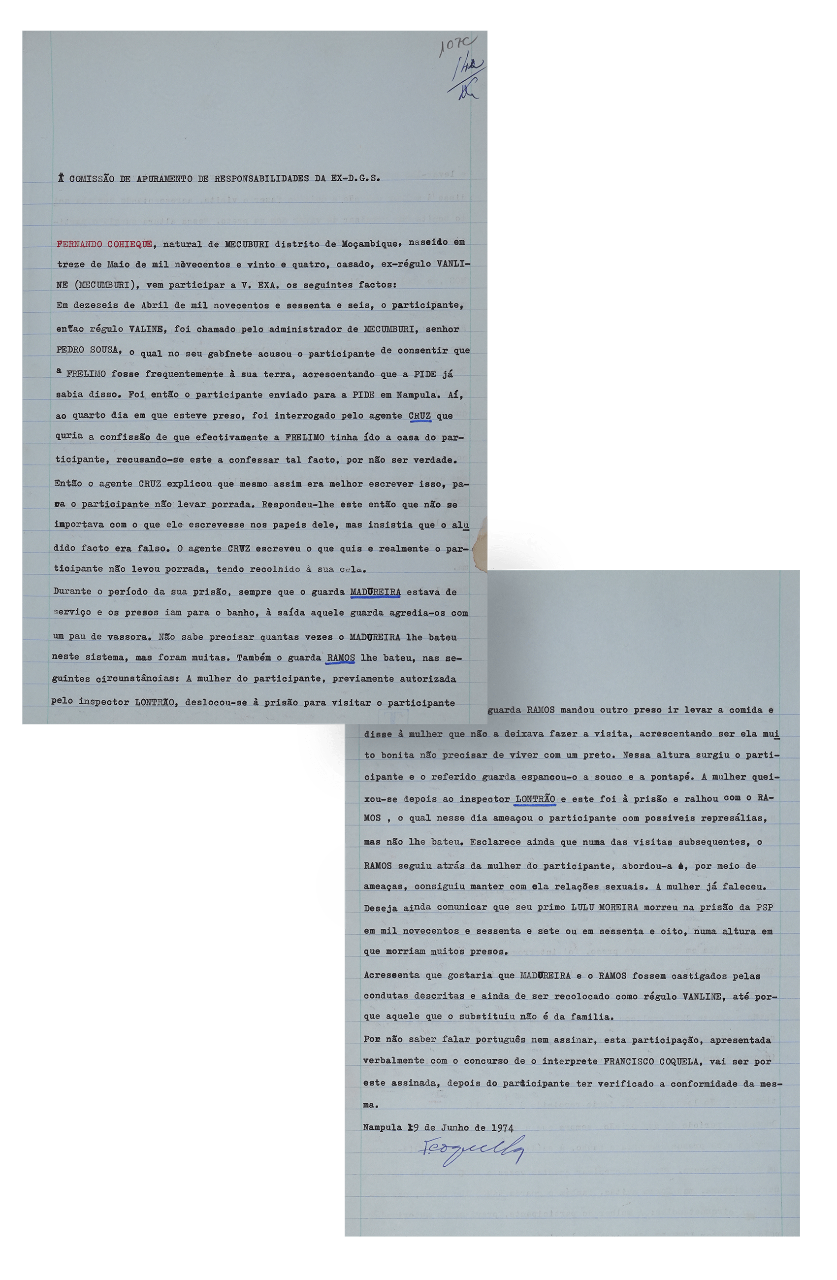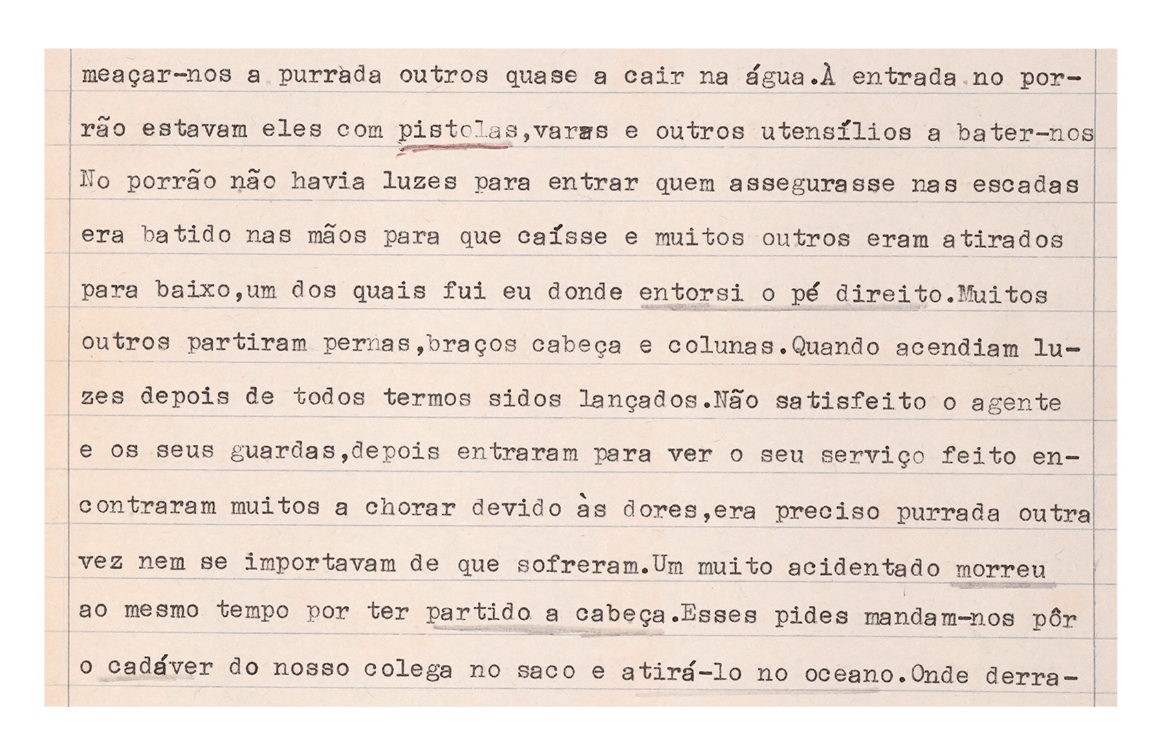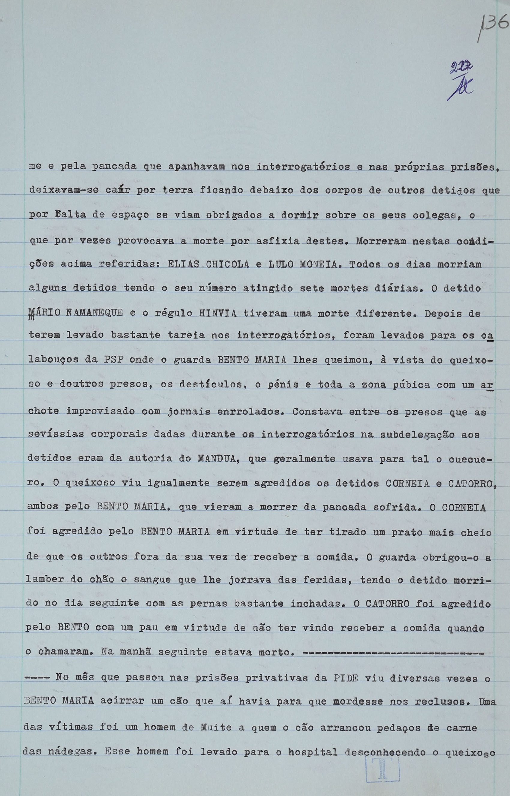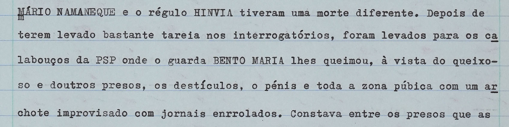 Aiamar Muacoma contou a “morte diferente” dos seus companheiros Mário Namaneque e Hinvia: “Depois de terem levado bastante tareia nos interrogatórios, foram levados para os calabouços da PSP onde o guarda Bento Maria lhes queimou, à vista do queixoso e doutros presos, os testículos, o pénis e toda a zona púbica com um archote improvisado com jornais enrolados.”