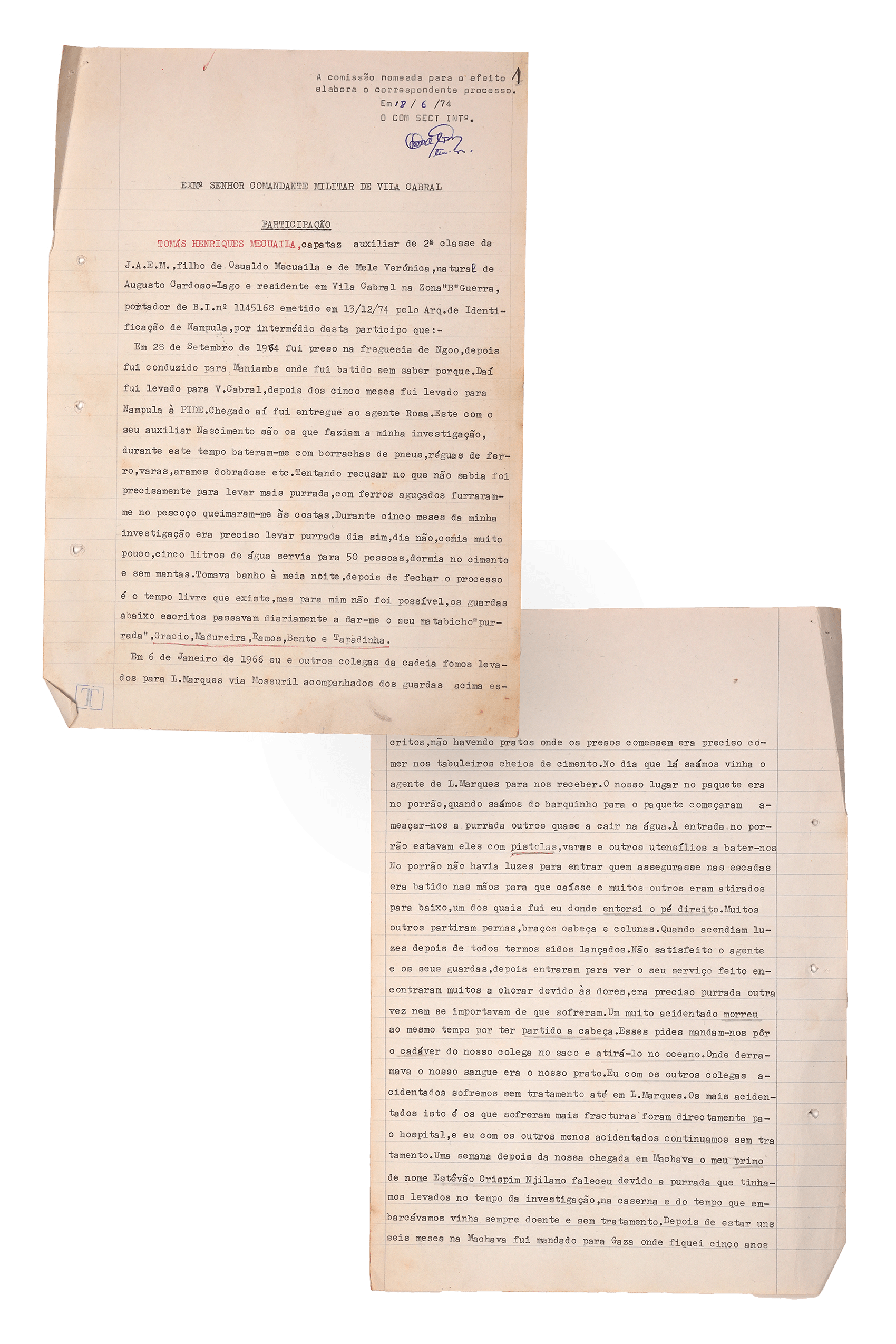 Tomás Henriques Mecuaila apresentou queixa junto da Comissão em Vila Cabral, a 18 de Junho de 1974