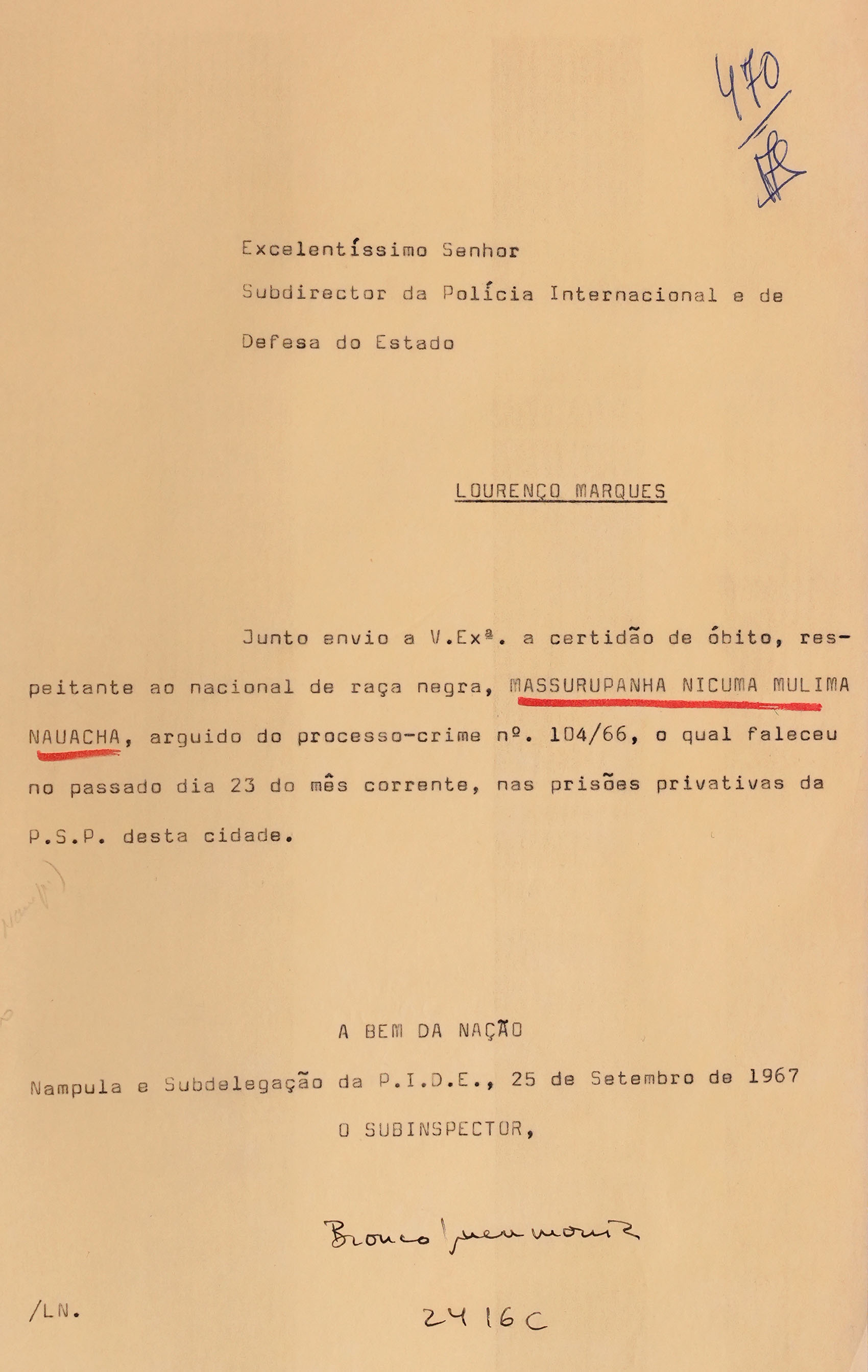 Em finais dos anos 1960 “morria muita gente” nos calabouços da PIDE, admitiram as mais de três dezenas de elementos da PSP inquiridos pela comissão. Muitas vezes, seis pessoas em apenas um dia. As mortes eram comunicadas à direcção em Maputo, através de ofícios breves nos quais se identificava o morto, a data e o local de óbito (“nesta subdelegação”, “nas prisões privativas da PSP” ou no hospital da cidade). Cópias destes documentos foram agregadas aos processos-crime. Em muitas, lê-se a manuscrito: “Decl. Bento Maria. Dr. Cruchinho”, isto é, a declaração de óbito tinha sido feita pelo guarda prisional e pelo médico que colaborava habitualmente com a PIDE, quase sempre nas celas. Era ainda o guarda quem requeria a certidão de óbito à Conservatória dos Registos de Nampula, informando a mesma da causa de morte: “Insuficiência cardíaca” ou “broncopneumonia” ou “nefrite aguda” ou “poliavitaminose”.
