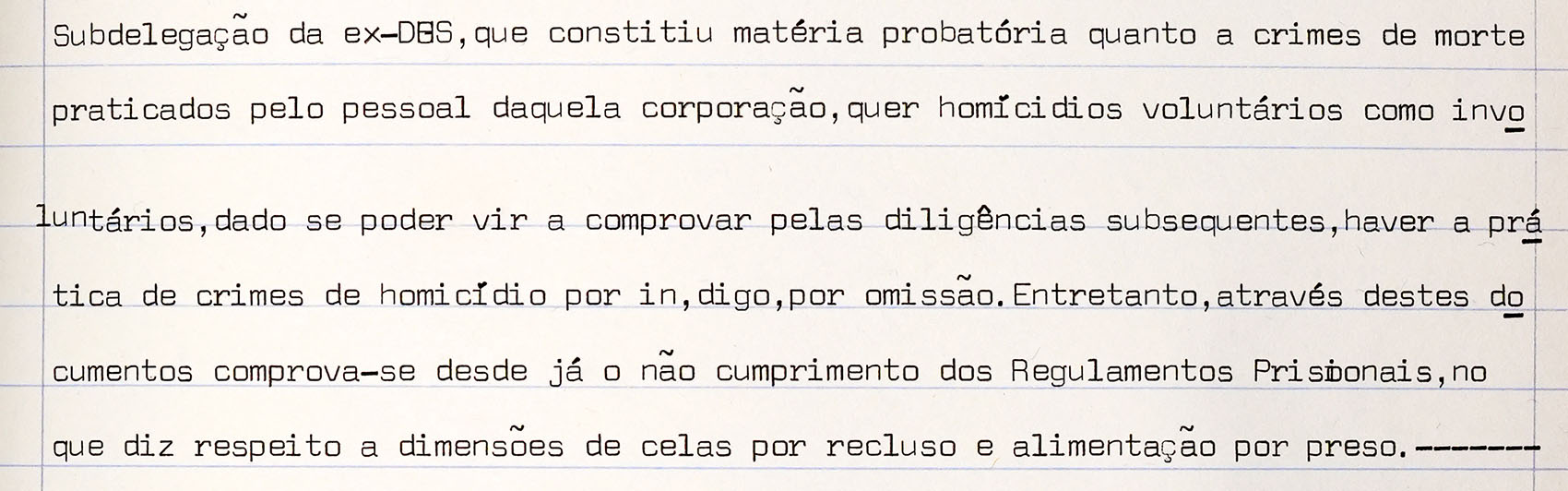Os reclusos inquiridos pelos militares nunca mencionaram carne e arroz, mas antes farinha celeste, feijão e por vezes peixe seco. Sempre em pouca quantidade e de má qualidade. Em Janeiro de 1973 as compras para a subdelegação constavam somente de farinha, feijão, óleo e farinha para cães.
