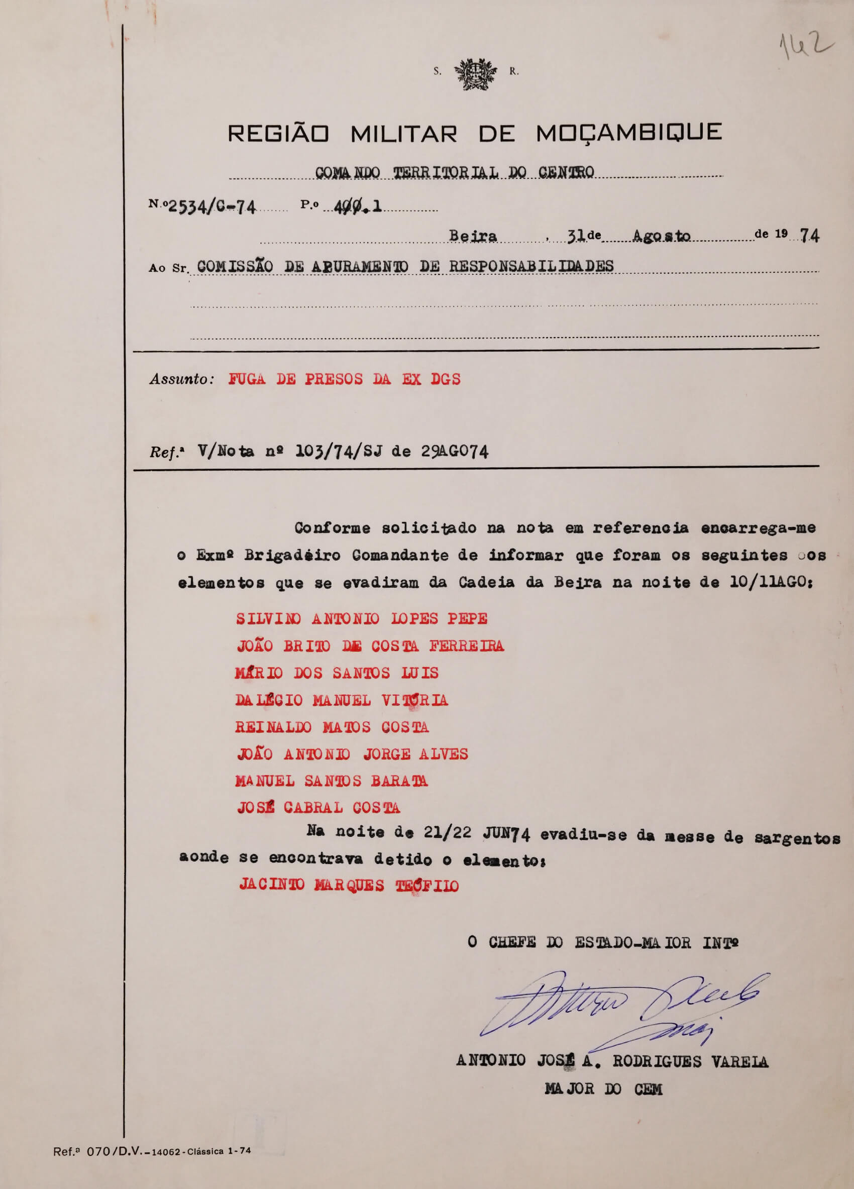 Instalada desde Maio de 1974 na moradia de Ponte Gea, onde umas semanas antes estava a PIDE, a comissão iniciou os seus trabalhos em Junho, pouco depois da operação das Forças Armadas que deteve meio milhar de pides em todo o país (Operação Zebra). A maioria foi transferida para a cadeia da Machava, em Maputo, mas alguns elementos que ali trabalhavam foram encarcerados na cadeia local. A decisão revelou-se desastrosa porque poucas semanas mais tarde muitos fugiram — em finais de Agosto, o comando militar que operava no centro da colónia informou oficialmente a comissão que nesse mês se tinham verificado duas fugas, identificando os foragidos: Silvino António Lopes Pepe, João Brito da Silva Ferreira, Mário dos Santos Luís, Idalécio (erradamente grafado como Dagélio no telegrama recebido pelos instrutores) Manuel Vitória, Reinaldo Matos Costa, João António Jorge Alves, Manuel Santos Barata, José Cabral Costa e Jacinto Marques Teófilo.