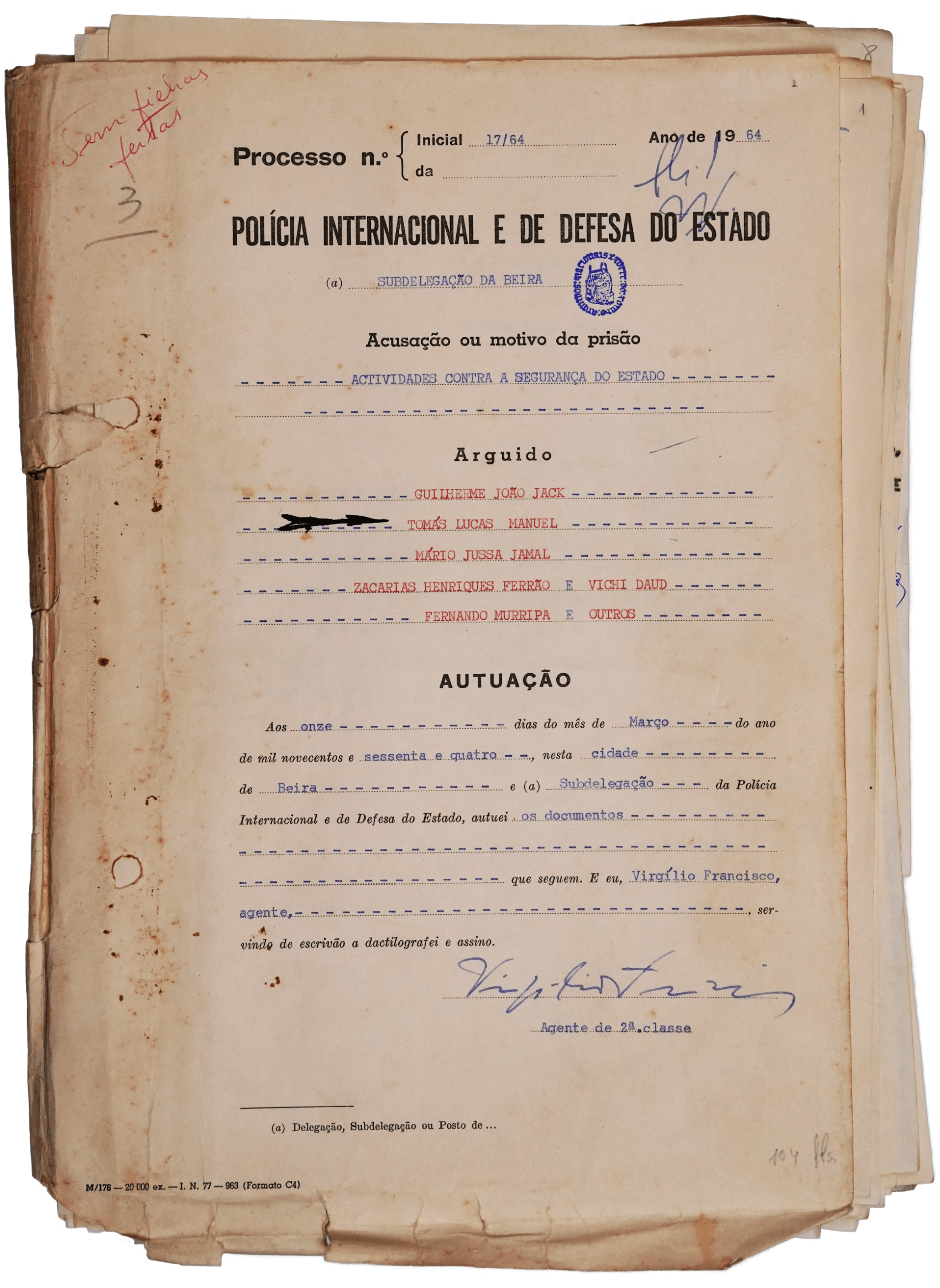 Portanto, quando as Forças Armadas tomaram a decisão, em Setembro de 1974, de destruir todo o arquivo da PIDE em Moçambique, muito património tinha já desaparecido. Mas nem todo: uma pasta com 104 folhas pertencente ao acervo da Beira foi enviada para Lisboa em data incerta e incorporada no Arquivo PIDE/DGS. Tratava-se de um processo-crime instaurado em 1964 com cinco arguidos, acusados de “actividades contra a segurança do Estado”. Na capa deste processo alguém escreveu no canto superior esquerdo: “Sem fichas feitas.”