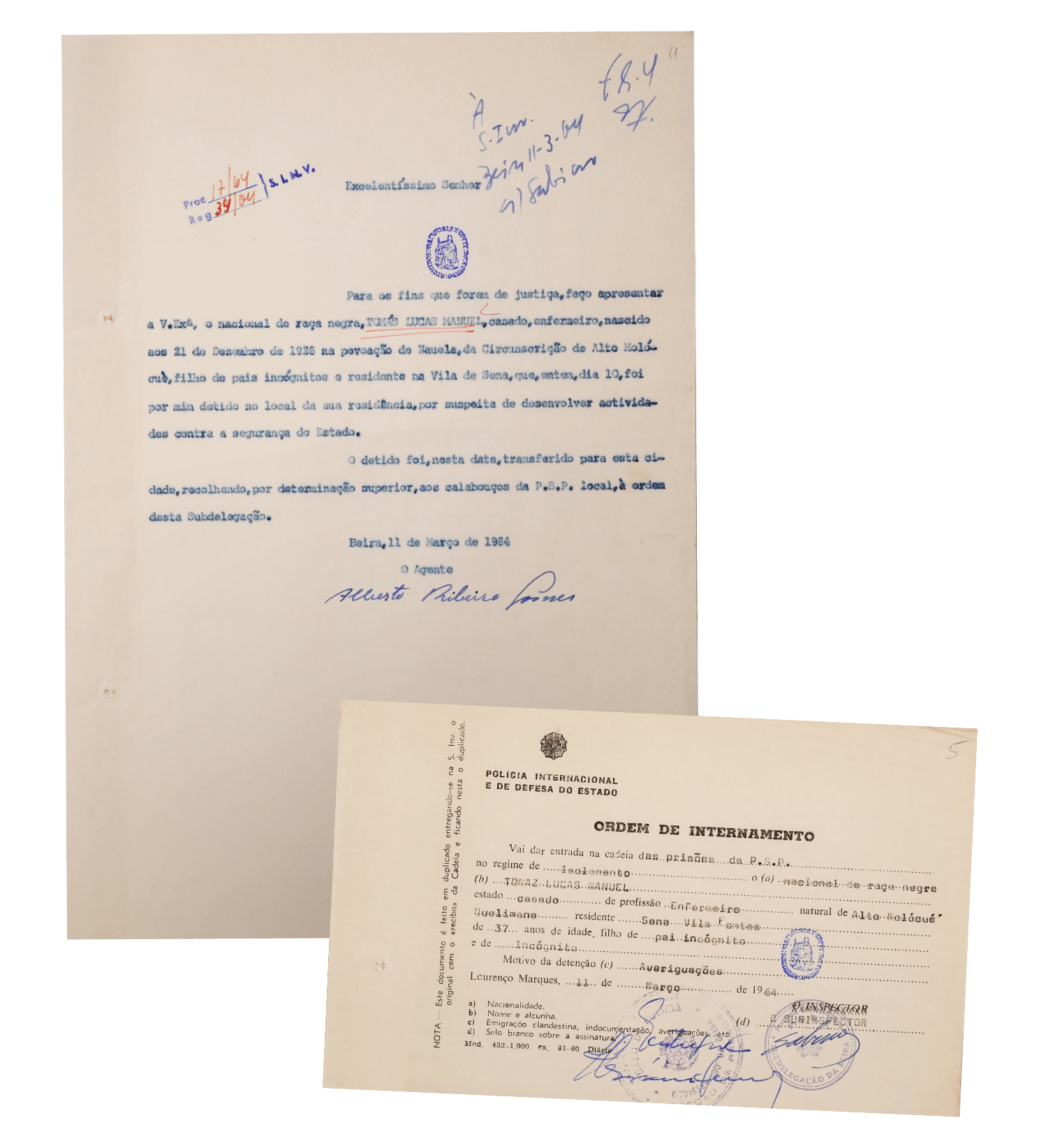 Documentos originais produzidos na subdelegação da Beira relativos à captura de Tomás Lucas Manuel a 10 de Março de 1964. Na “ordem de internamento” lê-se que foi detido para “averiguações”