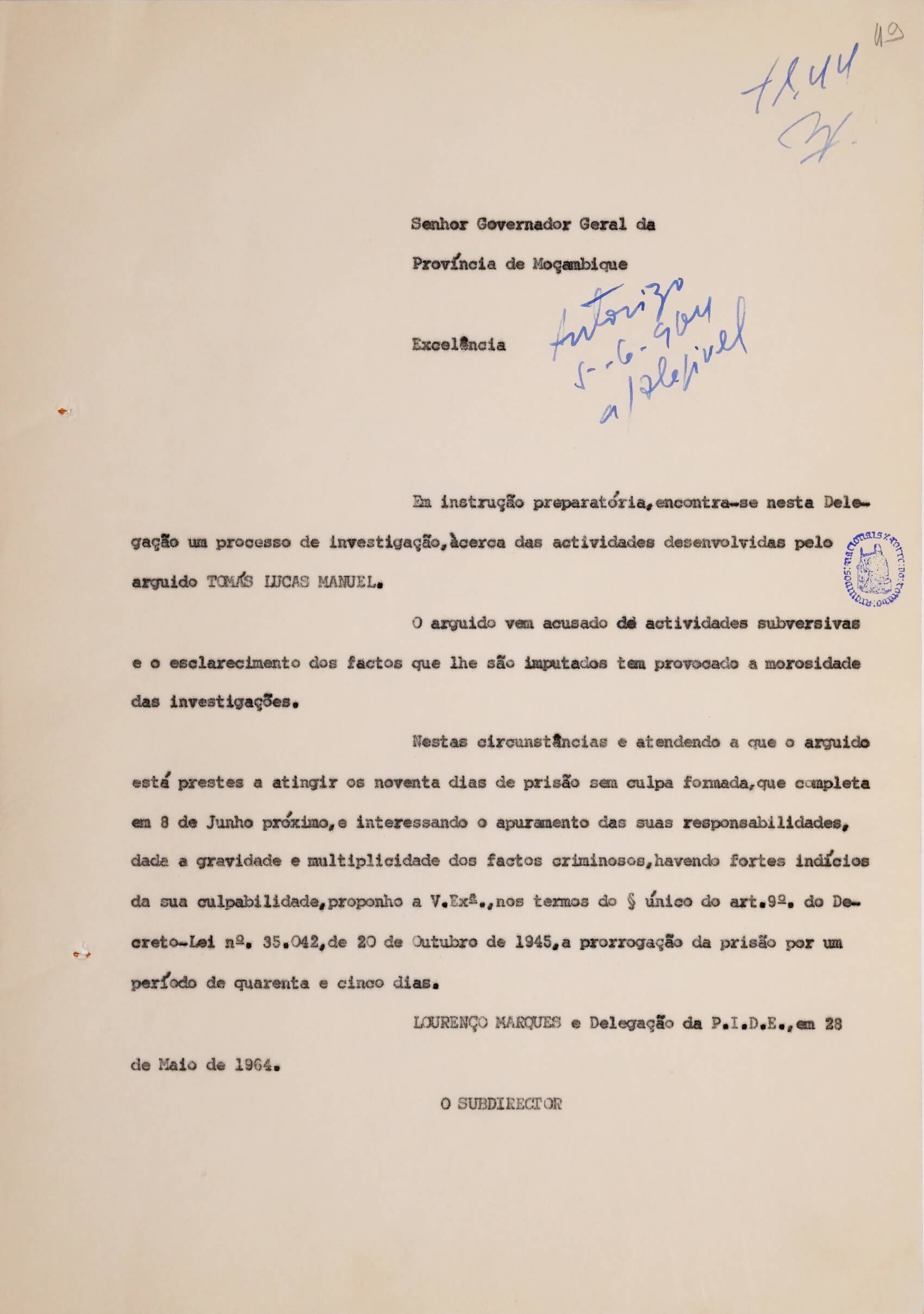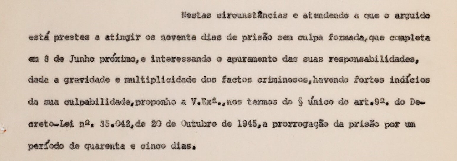 Entre estes papéis há ainda cópias dos pedidos de prorrogação dos prazos de prisão preventiva (legalmente prevista para três meses), dirigidos ao governador-geral e justificados com a “gravidade e multiplicidade dos factos criminosos” (não se especificava quais). A legislação penal definia que o prazo poderia ser protelado por mais dois períodos sucessivos de 45 dias, com a prévia homologação do Ministério do Interior, mas Tomás Lucas e Fernando Murripa permaneceram reclusos mais de três anos, até finais de 1967, sujeitos a “medidas administrativas de segurança” (um expediente largamente usado pela PIDE para prolongar indefinidamente a prisão preventiva).
