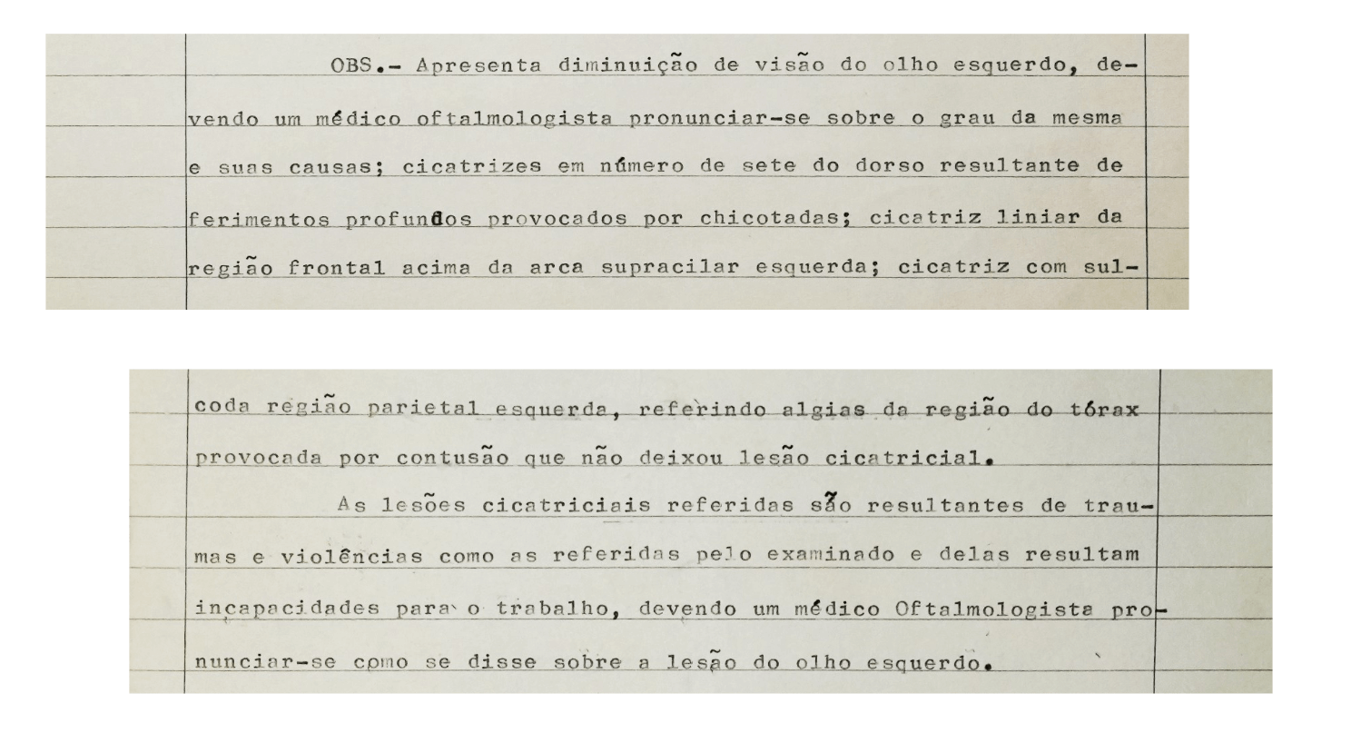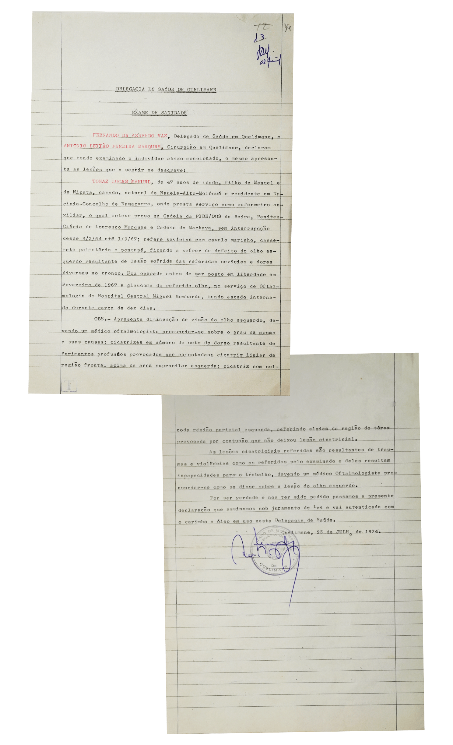 A perícia médica feita a Tomás Lucas, requerida pelos militares, chegou em finais de Julho: “Diminuição da visão do olho esquerdo (…); cicatrizes em número de sete do dorso resultantes de ferimentos profundos provocados por chicotadas; cicatriz linear da região frontal acima da arca superior esquerda; cicatriz com sulco da região parietal esquerda (…). As lesões cicatriciais referidas são resultantes de traumas e violências como as referidas pelo examinado e delas resultam incapacidade para o trabalho”, registaram os médicos António Leitão Pereira Marques e Fernando de Azevedo Vaz. A comissão pediu ainda um relatório clínico ao hospital da Beira, onde Tomás fizera uma cirurgia ao olho, mas nada consta no processo.